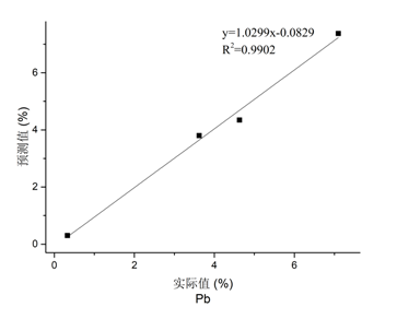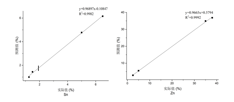 In the analysis, first use different types of copper alloy samples for analysis, set the test time as 30s, and analyze the contents of three elements: lead Pb, zinc Zn, and tin Sn. In the analysis, the actual content and measured value of the elements are used as the horizontal axis and the vertical axis respectively, and linear fitting is carried out. The fitting and analysis results show that the instrument can accurately reflect the actual content of elements in different samples, and has good on-site analysis capabilities.