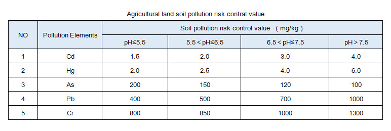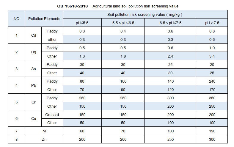 In 2018, in order to implement the Environmental Protection Law of the People's Republic of China, protect soil environmental quality, and control soil pollution risks, the Ministry of Ecology and Environment and the StateThe State Administration of Market Supervision and Administration jointly issued the "Soil Environmental Quality-Agricultural Land Soil Pollution Risk Control Standard (Trial)" (GB15618-2018).