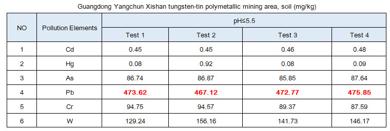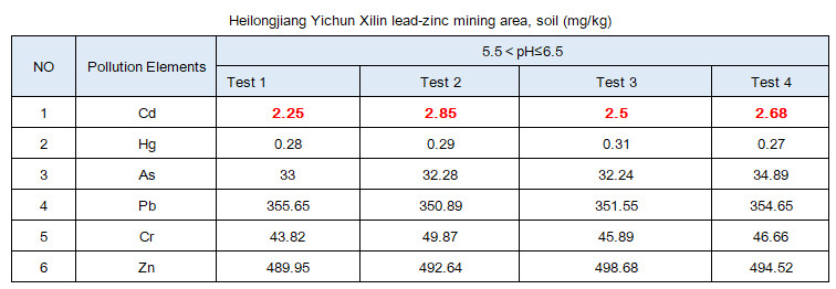 We compared the test results with the pollution risk screening value and pollution risk control value in GB15618-2018 and found that the cadmium (Cd) element content in soil samples from the Xilin lead-zinc mining area in Yichun, Heilongjiang exceeded the pollution risk control value; Xishan, Yangchun, Guangdong The lead (Pb) element content in soil samples from the tungsten-tin polymetallic mining area exceeded the pollution risk screening value; the heavy metal element content in the water system sediment samples from the Hualong Lashuixia copper-nickel mining area in Haidong, Qinghai was lower than the pollution risk screening value.